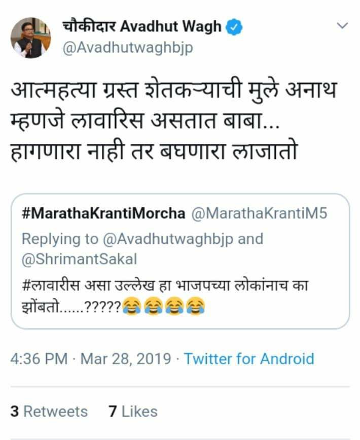 आत्महत्याग्रस्त शेतकऱ्यांची मुले लावारिस असतात – भाजप प्रवक्ते अवधूत वाघमुंबई: भाजप प्रवक्ते अवधूत वाघ पुन्हा एकदा आपल्या वादग्रस्त वक्तव्यामुळे वादाच्या भोऱ्यात सापडले आहेत. अवधूत वाघ यांनी आत्महत्याग्रस्त शेतकऱ्यांच्या मुलांचा अनाथ असा उल्लेख केला आहे. आत्महत्याग्रस्त शेतकऱ्यांची मुले अनाथ म्हणजे लावारिस असतात असं अवधूत वाघ यांनी म्हटलं आहे. ट्विट अकाउंटवर एका ट्विटला उत्तर देताना अवधूत वाघ यांनी हे वादग्रस्त विधान केले.चौकीदार अवधूत वाघ नावाने त्यांचं ट्विटर अकाऊंट असून त्यांनी आपल्या ट्विटमध्ये असे म्हंटले आहे कि, “आत्महत्याग्रस्त शेतकऱ्यांची मुले अनाथ म्हणजे लावारिस असतात बाबा… हागणारा नाही तर बघणारा लाजतो.”मराठा क्रांती वॉरियर या ट्विटर हँडलवरुन करण्यात आलेल्या एका ट्विटला उत्तर देताना वाघ यांनी खालच्या पातळीवर जात शेतकऱ्यांच्या मुलांवर वादग्रस्त वक्तव्य केले. शेतकरी पुत्र आणि सर्वसामान्यांचा आवाज असणाऱ्या असलेल्या पत्रकारांना ट्रोल करू नका, असा इशारा मराठा क्रांती वॉरियरकडून देण्यात आला होता. या ट्विटला अवधूत वाघ यांनी ‘आत्महत्याग्रस्त शेतकऱ्याची मुले अनाथ म्हणजे लावारिस असतात बाबा…’, असे उत्तर दिले. त्यांच्या या ट्विटनंतर सोशल मीडियावर मोठ्या प्रमाणात त्यांच्याविरुद्ध संताप व्यक्त केला जात आहे. हे ट्विट नंतर काढण्यात आले आहे.