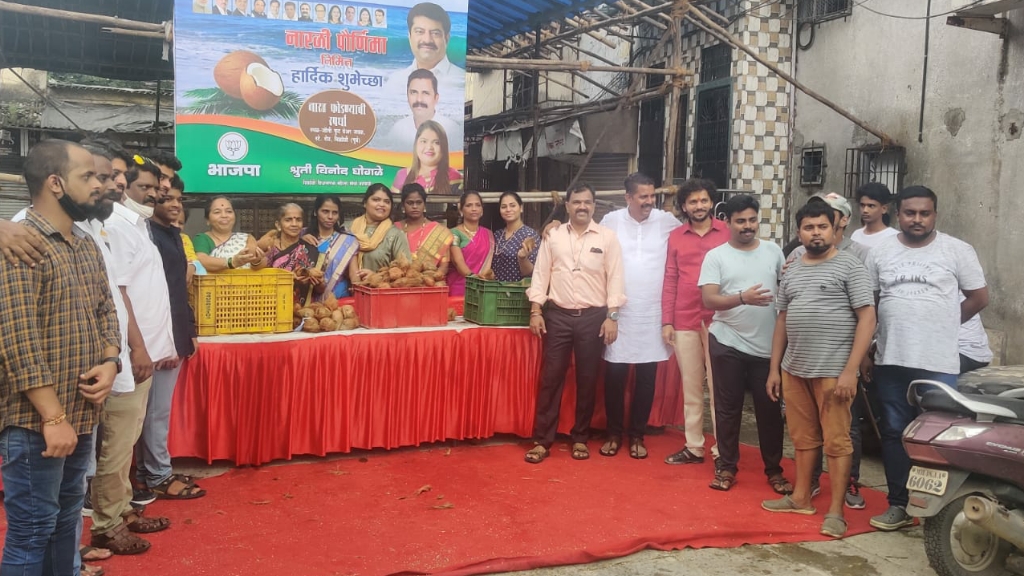 विक्रोळी, दि.२२: राज्यात विशेषतः कोकण किनारपट्टीवरील सर्व जिल्ह्यांत नारळी पौर्णिमेचा सण मोठ्या उत्साहात साजरा करण्यात आला. मुंबईतील विक्रोळी परिसरात भारतीय जनता पक्षाच्या विक्रोळी विधानसभा महिला महामंत्री श्रुती घोगळे यांनी या निमित्ताने स्थानिक व्यापऱ्यांच्या सोबतीने एक कार्यक्रम आयोजित केला होता.