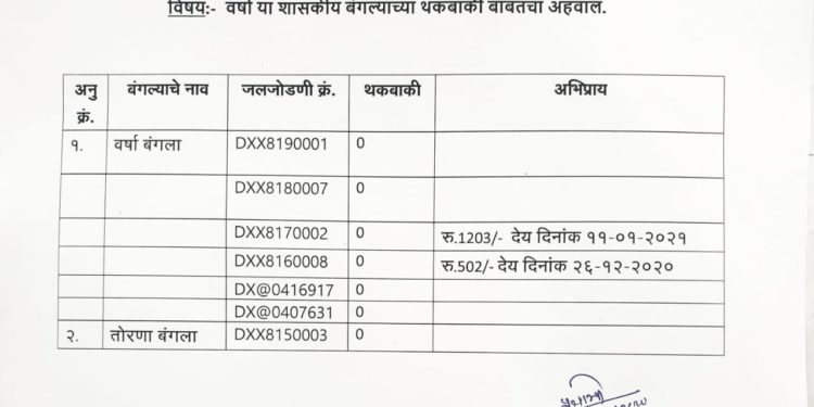 मुख्यमंत्र्यांचे शासकीय निवासस्थान म्हणून मलबार हिल स्थित ‘वर्षा’ आणि त्याच्याशी संलग्न ‘तोरणा’या बंगल्यांचा समावेश आहे. या बंगल्यांचे पाणी बिल थकीत असल्याच्या वृत्तामध्ये तथ्य नाही. बृहन्मुंबई महानगरपालिकेच्या जलकामे विभागाच्या कार्यालयाने याबाबत थकबाकी अहवाल दिला आहे. त्यामध्ये या दोन्ही बंगल्यांची थकबाकी निरंक असल्याची वस्तुस्थिती स्पष्ट करण्यात आली आहे.