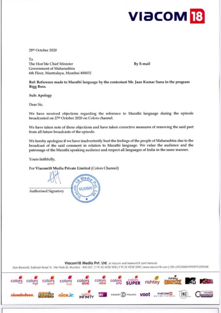 या सर्व पार्श्वभूमीवर अखेर कलर्स वाहिनीने मुख्यमंत्री उद्धव ठाकरे यांच्या नावे माफीनामा लिहीत महाराष्ट्रातील जनतेची माफी मागितली आहे. तसेच हा भाग आपल्या वाहिनीवरून हटविण्यात आला असल्याचे सांगितले. सध्यातरी या प्रकरणी गायक जान कुमार सानूने स्वस्त प्रसिद्धीसाठी मराठी भाषेवर टीका करत सर्वांचे लक्ष वेधून घेतल्याचे दिसते.