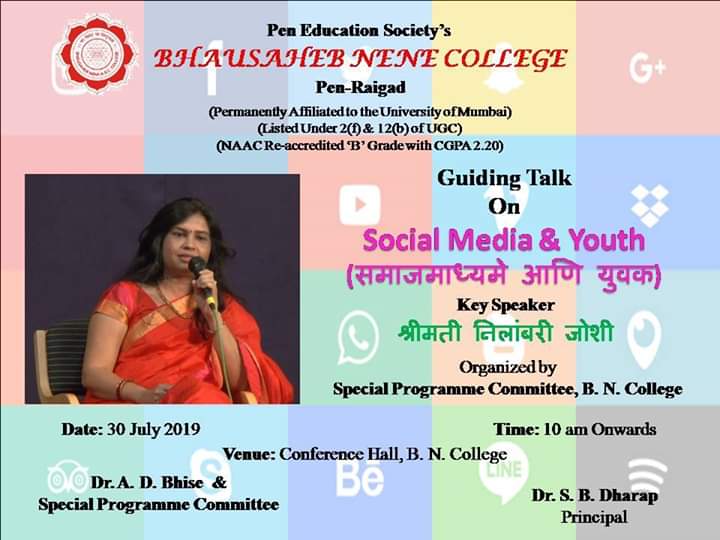 समाज माध्यमे आणि युवक या विषयावर नीलांबरी जोशी यांचे ३० जुलै रोजी पेण येथे व्याख्यान