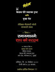 याच म्हणजे “सोशल मिडिया : शाप की वरदान?” या विषयावर येत्या शनिवारी १९ नोव्हेंबर रोजी मुंबईतील गोरेगांव येथे “केशव गोरे स्मारक ट्रस्ट” आणि “पुन्हा भेट” यांनी ख्यातनाम लेखिका नीलांबरी जोशी यांचं व्याख्यान आयोजित केलं आहे. नुकतंच त्यांचं ‘माध्यमकल्लोळ’ हे पुस्तक प्रकाशित झालं आहे. माध्यमविश्वाचा सखोल आढावा घेणाऱ्या या पुस्तकात त्यांनी सोशल मीडियाशी संबंधित अनेक विषयांबाबत सविस्तर भाष्य केलं आहे.