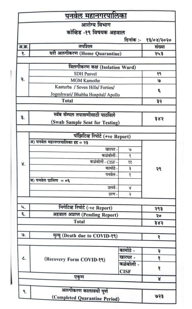 पनवेल: पनवेल महानगरपालिकेकडून कोरोना कोविड-१९ संदर्भातली ताजी आकडेवारी प्रसिद्ध करण्यात आली असून पनवेल महानगरपालिका क्षेत्र व ग्रामीण विभाग पकडून एकूण २९ रुग्ण कोरोना पोसिटीव्ह आहेत. यात २५३ जणांना घरी अलगिकरणात ठेवण्यात आले असून ३२ लोकांना विलगीकरण कक्षात ठेवण्यात आले आहे. २९३ लोकांचा अहवाल निगेटिव्ह आला आहे. ७२३ लोकांचा अलगिकरण कालावधी संपला आहे. कोरोना संसर्ग बाधित रुग्ण वाढण्याची गती पनवेल विभागात मुंबईच्या मानाने मंद आहे.