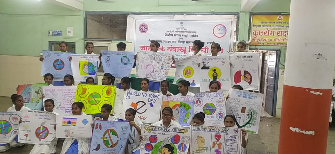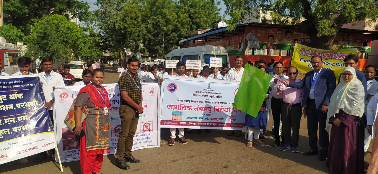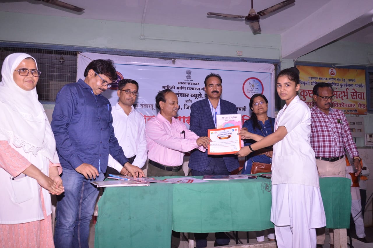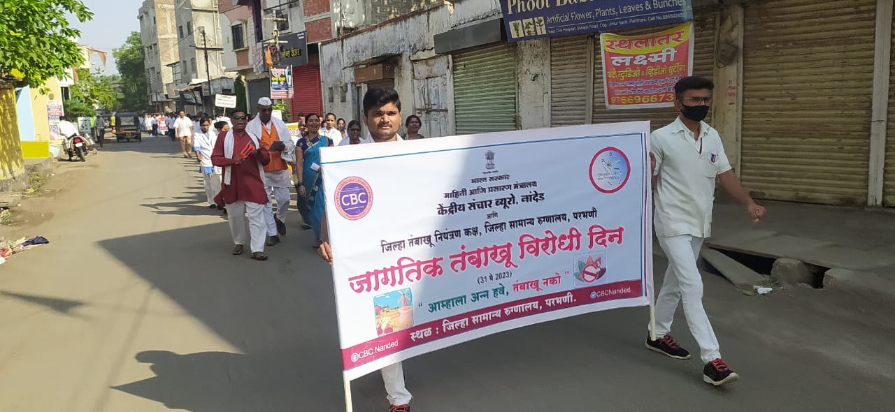 केंद्र सरकारच्या माहिती आणि प्रसारण मंत्रालयाच्या अंतर्गत नांदेड येथील केंद्रीय संचार ब्यूरो कार्यालय व जिल्हा तंबाखू नियंत्रण कक्ष, जिल्हा रुग्णालय परभणी, मराठवडा ग्रामीण विकास संस्था यांच्या संयूक्त विद्यमाने आज तंबाखू विरोधी दिननिमित्त ‘आम्हाला अन्न हवे, तंबाखू नको’ या संकल्पनेवर अधारित कार्यक्रमाचे आयोजन करण्यात आले त्याप्रसंगी सुक्रे हे बोलत होते. यावेळी जिल्हा सामान्य रुग्णालायाचे शल्य चिकित्सक डॉ. सुहास जगताप, अतिरिक्त शल्य चिकित्सक डॉ. जयश्री यादव, निवासी वैद्यकीय अधिकारी डॉ. कल्याण कदम, जिल्हा विधी सेवा प्रधिकरणाचे विधिज्ञ गणेश सेलूकर, तंबाखू नियंत्रण कक्षाच्या डॉ. रुपाली रणविरकर, मानस तज्ञ केशव गव्हाणे, क्षेत्रीय प्रचार अधिकारी माधव जायभाये, सहायक क्षेत्रीय प्रचार अधिकारी सुमित दोडल, मराठवाडा ग्रामिण विकास संस्थेचे अभिजीत संघई आदी मान्यवरांची उपस्थिती होती.