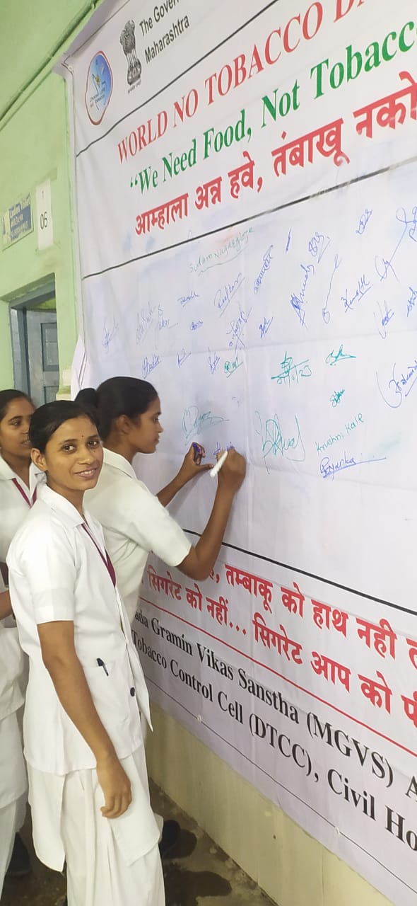 तंबाखू सेवनामुळे होणाऱ्या आजारांपासून लोकांची जनजागृती करण्यासाठी पोस्टर स्पर्धा घेण्यात आली. या सर्व पोस्टरचे प्रदर्शन जिल्हा रुग्णालयातील ओपीडी हॉलमध्ये भरविण्यात आले आहे. यावेळी रांगोळी स्पर्धाही घेण्यात आली. या स्पर्धेतील विजेत्या विद्यार्थ्यांचे प्रमाणपत्र व पारितोषिक देवून मान्यवरांच्या हस्ते गौरव करण्यात आला. शाहीर काशिनाथ उबाळे यांच्या कलापथकाने तंबाखू सेवनामुळे होणाऱ्या आजारांची मनोरंजनाच्या माध्यमातून माहिती देत आजच तंबाखू सेवन सोडण्याचे आवाहन केले.