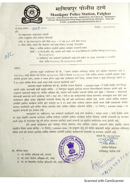 पश्चिम वसई येथील दिवानमान या गावालगच्या परिसरात तब्लिगी इज्तेमा या धार्मिक कार्यक्रमास परवानगी मिळावी म्हणून शमीम एज्युकेशन अॅन्ड वेलफेअर सोसायटीने गृह विभागास रितसर पत्र देऊन परवानगी मागितली होती. दिनांक १४ व १५ मार्च रोजी वसई येथे हा धार्मिक कार्यक्रम होणार होता. यामध्ये कुरआन पठन, प्रवचन व नमाज आदी कार्यक्रम होणे अपेक्षित होते. या कार्यक्रमास साधारणपणे ५० हजार भाविक जमणार असल्याचे संस्थेच्या वतीने कळविण्यात आले होते. सोसायटीच्या विनंतीवरून पोलिस यंत्रणेने दिनांक ५ फेब्रुवारी २०२० च्या पत्रान्वये कार्यक्रमास परवानगी देत असल्याचे सोसायटीला कळविले होते.