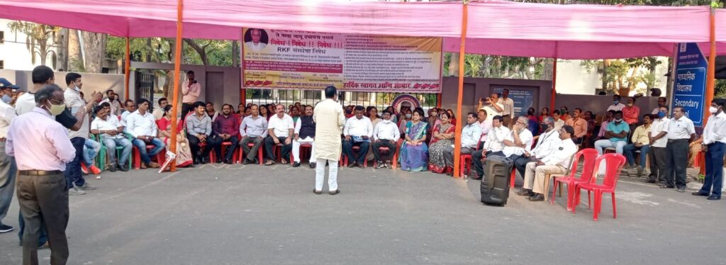 उरण, दि.२५(विठ्ठल ममताबादे): आर.के.एफ. या संस्थेने मुख्याध्यापक रमाकांत गावंड यांना सक्तीच्या रजेवर पाठविण्याबाबतचे नियमबाह्य पत्र देऊन शासकीय नियमांचा भंग केल्यामुळे त्याचा निषेध करण्यासाठी तसेच सदर नोटीस त्वरित मागे घ्यावी आणि शासन निर्णयाप्रमाणे बंधनकारक असणाऱ्या इतर मागण्या मान्य करण्यासाठी शाळेच्या गेटवर कोविड १९ च्या नियमांचे पालन करून सर्व पालक, शिक्षक, शिक्षकेत्तर कर्मचाऱ्यांनी संविधानिक मार्गाचे अवलंब करून दि. २०/१२/२०२१ पासून बेमुदत धरणे आंदोलनाला सुरवात केली होती. दिनांक २४/१२/२०२१ रोजी बेमुदत धरणे आंदोलनाला यश आले असून शिक्षक व पालकांच्या सर्व मागण्या मान्य करण्यात आल्या आहेत.