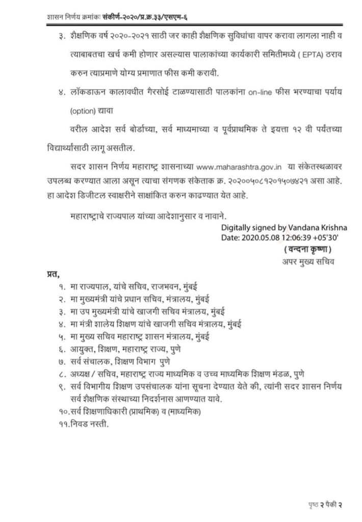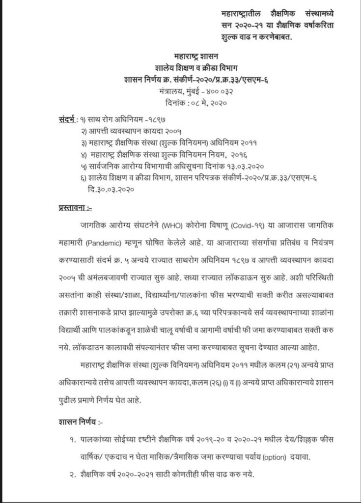यासंदर्भातील तक्रारी आल्यावर शिक्षणमंत्र्यांनी थेट शासन निर्णय काढत सर्व शिक्षणसंस्थांना व त्यांच्या व्यवस्थापनाला २०२०-२०२१ साठी शुल्कवाढ करू नये अथवा कारवाई होईल तसेच लॉकडाऊन उठल्यावर मागील वर्षातील बाकी राहिलेली व चालू वर्षातील मासिक फी एकदाच न घेता मासिक अथवा त्रैमासिक घ्यावी असे आदेश दिले आहेत.